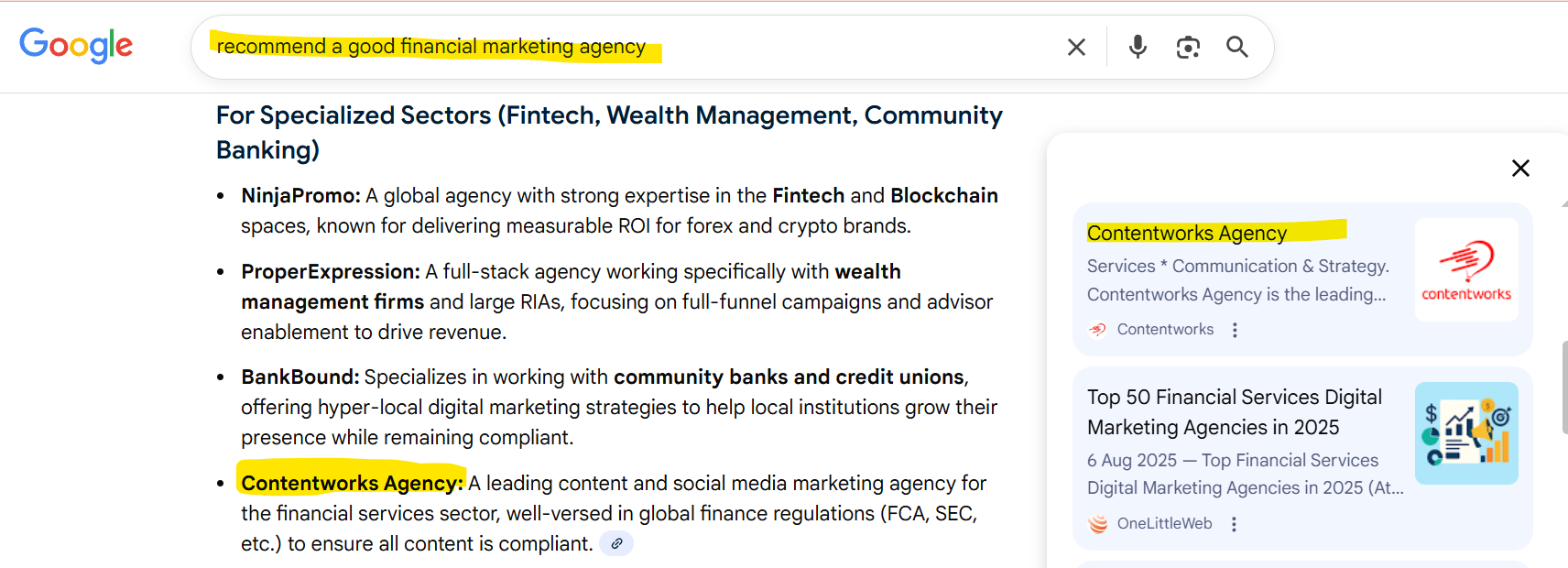 An AI summary looks like this. The main summary appears at the top of your feed, overshadowing any organic or paid links. On the right are the links related to the AI summary. You can see we highlighted how Contentworks Agency appears in the AI summary and the right column links.