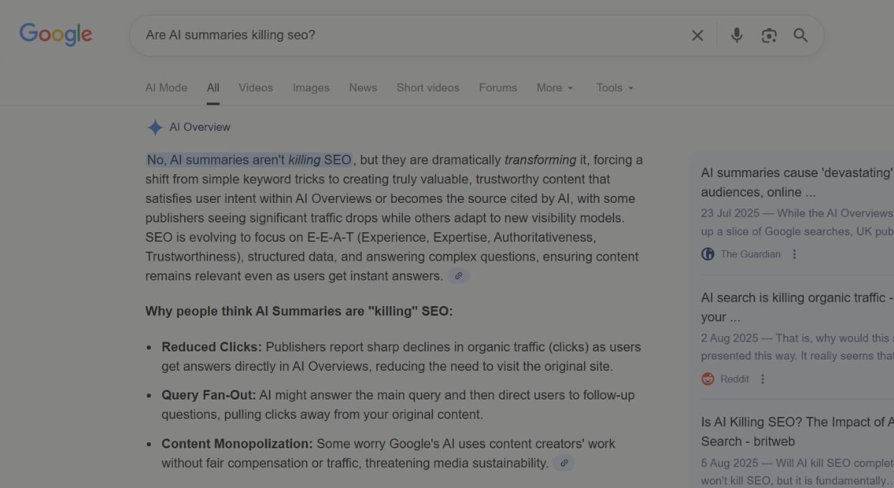 Just to reiterate, traditional SEO is not dead, and AI summaries did not kill your SEO. That said, we are now combining SEO and GEO (Generative Engine Optimisation), to ensure our clients remain visible both in classic organic results and in AI-generated answers.